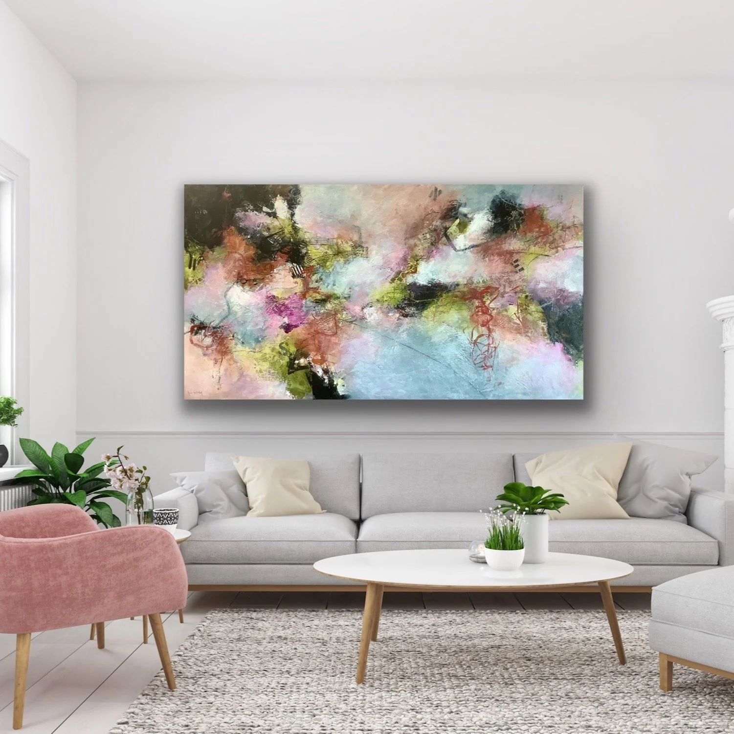 My abstract compositions and colour palettes are a visceral response to my moods, feelings and sensory perception of the landscape surrounding me. I freely embrace a multi-layering process of bold shapes, fluid lines and textures, alongside soft gradients, all of which shift and evolve as my emotions dictate.